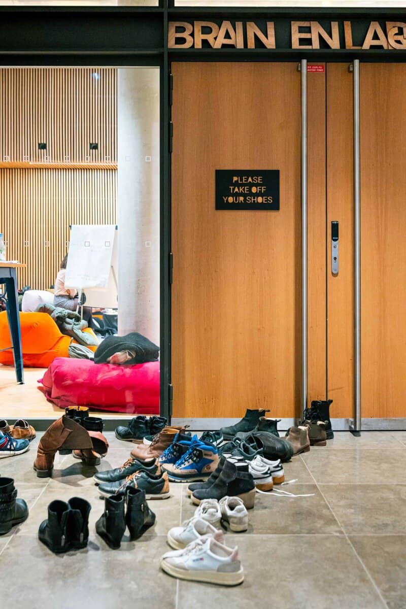 Le lien entre espace et innovation intéresse depuis longtemps. Mais l’organisation, l’aménagement, la perception des espaces changent beaucoup, de même qu’évolue la relation au corps à travers le temps et l’espace. Olivier Irrmann, professeur en gestion de l’innovation et codesign à Junia (école d’ingénieurs de l’université Catholique de Lille), a pris l’exemple des chaussures, que les 40 participant·es à l’événement ont déposées à l’entrée du Learning Center : « Ici, enlever ses chaussures est inhabituel et induit un changement de posture. Alors qu’en Finlande et en Suède, cela va de soi, culturellement on ne porte pas de chaussures dans les espaces intérieurs. »