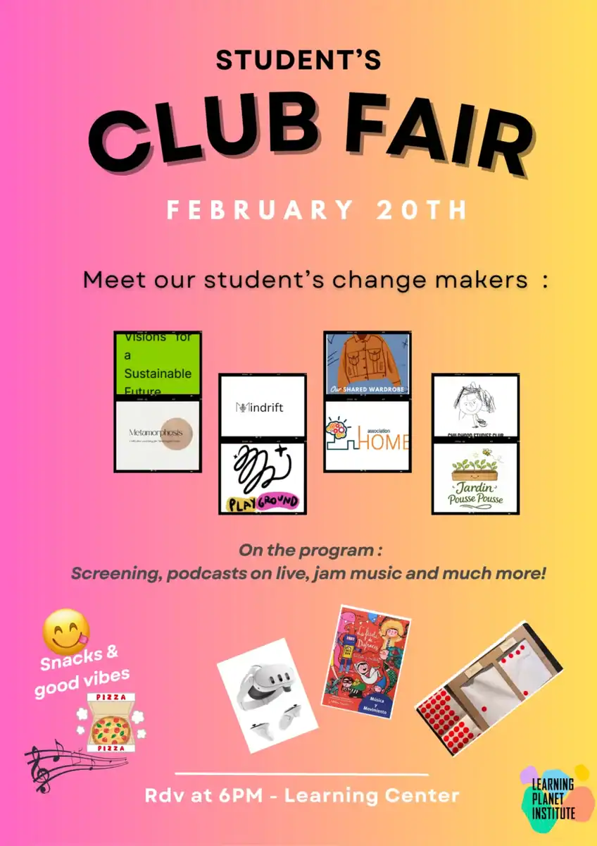 You are all invited to the students CLUB FAIR on Friday 20th February at 6PM at the Learning Center. Students will show what they do, how they engage themselves to make a better world, a better campus.