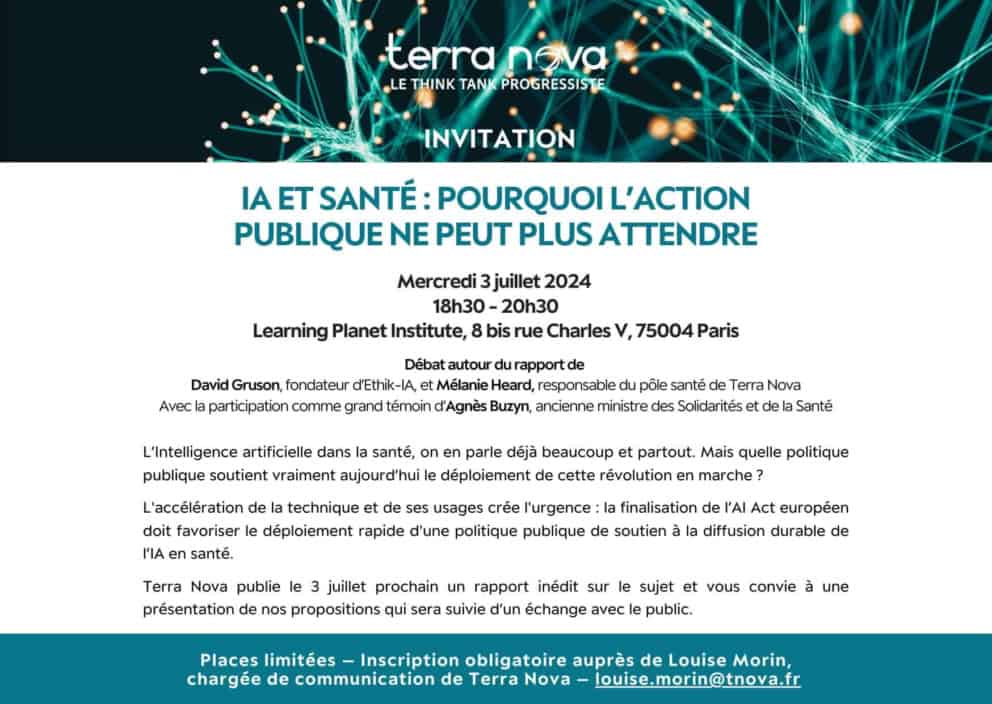 Wednesday, July 3 at 6:30 p.m. at Learning Planet Institute, Terra Nova- think tank organizes a debate on our forthcoming report on AI and healthcare with its authors Melanie Heard, division manager hashtaghealth from Terra Nova- think tank and David Gruson, founder of’Ethik IA, in the presence of’Agnès Buzyn, former Minister of Solidarity and Health.
