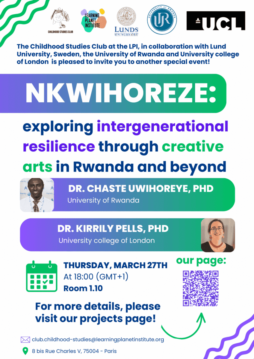 About Dr. Chaste, He is National Director of UYISENGA NI IMANZI (a Rwandan NGO) and has solid experience in institutional management. He has served on the boards of various organizations, both local and international. Chaste is an expert in trauma healing and a key player in peace-building and reconciliation. He is innovative, confident, optimistic, inspiring and advises people from all walks of life on life restoration and healing. He has conducted extensive research and implemented various models of rehabilitation and healing in the field of mental health. An inspirational therapist, he has led rehabilitation programs for genocide survivors, ex-combatants, children of armed groups and people in conflict with the law.About Kirrily, Her research, teaching and public engagement are in the field of critical childhood studies, and her work focuses on global childhood and children's rights, particularly in relation to violence, memory, peace and social justice. Her research projects focus on creative arts, arts-based methods and co-production. At UCL, she is a member of the Critical Childhood Studies Research Group and her current research focuses on intergenerational memories in the context of the Tutsi genocide in Rwanda in 1994. Nkwihoreze: Intergenerational Creative Arts and Healing in Rwanda(https://www.nkwihoreze.org/) is a collaborative research and engagement project that works closely with partner organizations and communities in Rwanda using artistic methods.