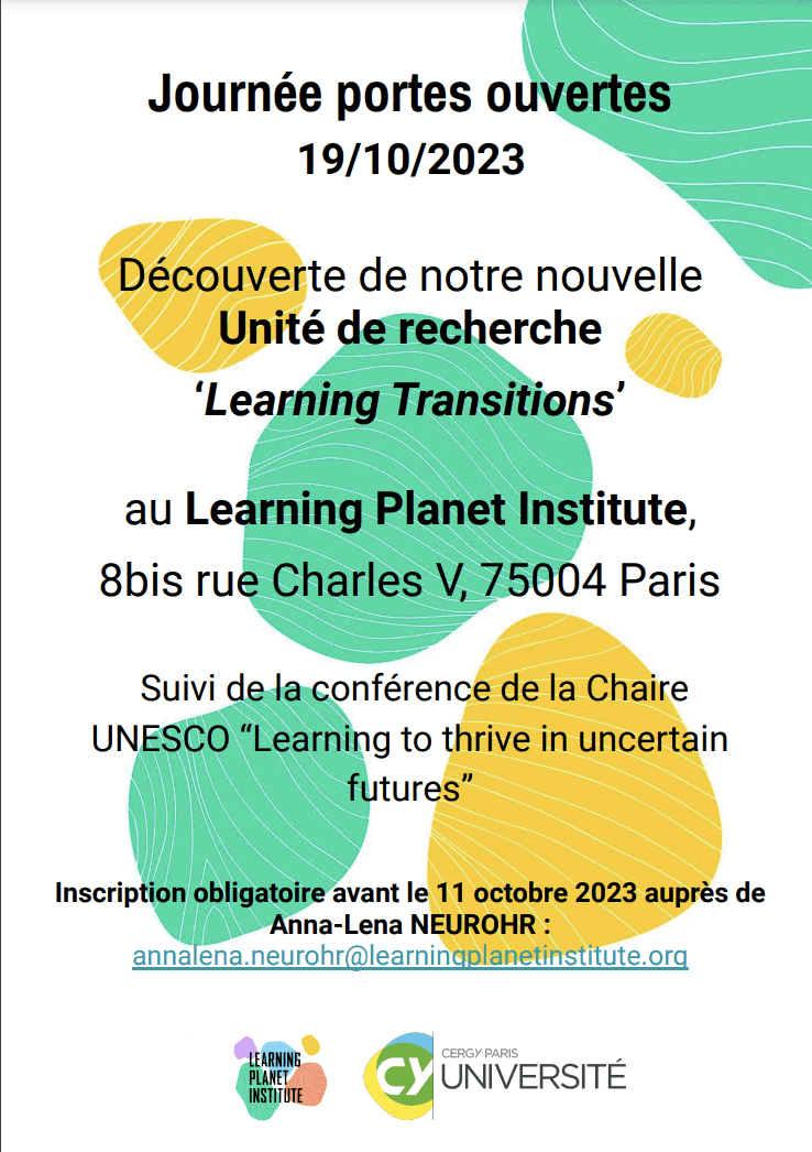 The open day for our new Learning Transitions Research Unit will take place on Thursday, October 19, from 12:30 to 5:30 pm, at the Learning Planet Institute.