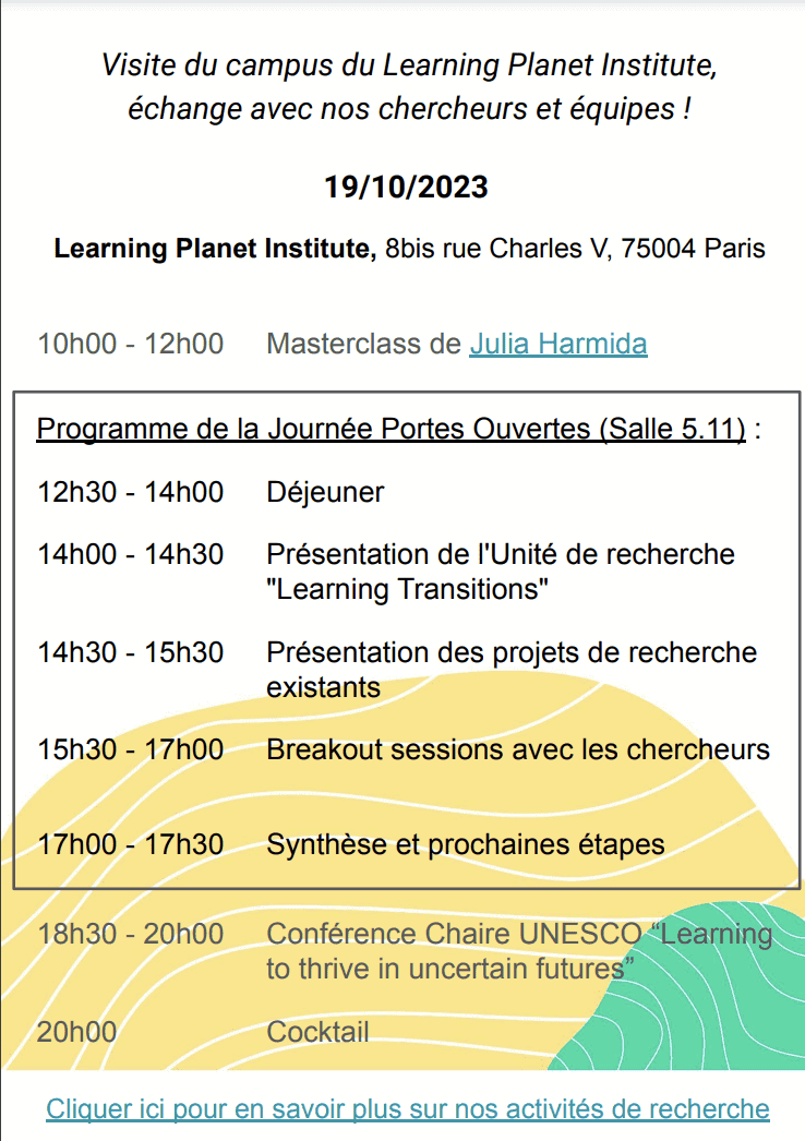 We invite all interested researchers to discover our new Learning Transitions research unit, visit the Learning Planet Institute campus and talk to our researchers and teams.