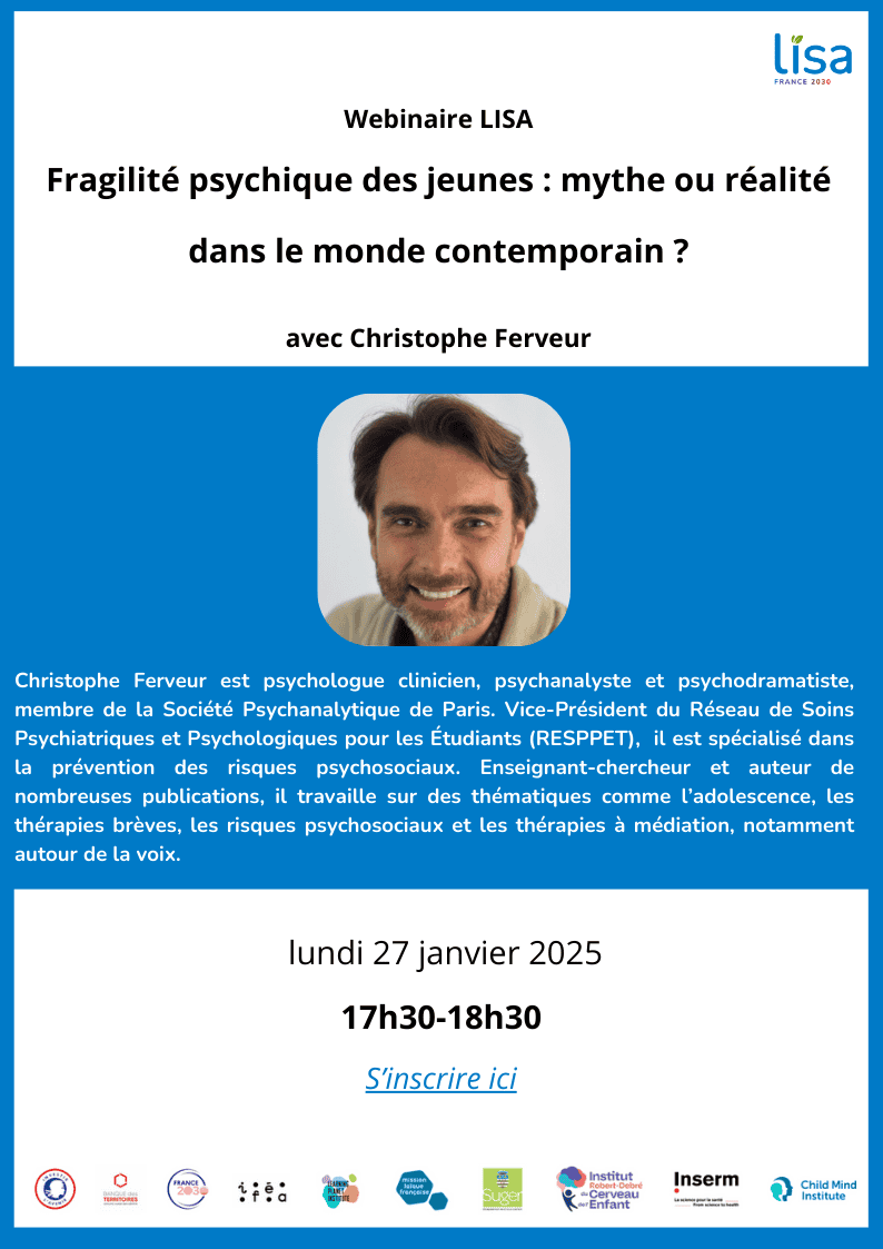 Also a teacher-researcher, he contributes to numerous training frameworks (Psycho-Prat, university DUs, specialized associations) and publishes on themes such as adolescence, brief psychotherapies and mediated therapies. Drawing on his experience in polyphonic singing and vocal technique, he has developed innovative therapeutic approaches, notably with hospitalized adolescents. This webinar is organized as part of the LISA project.