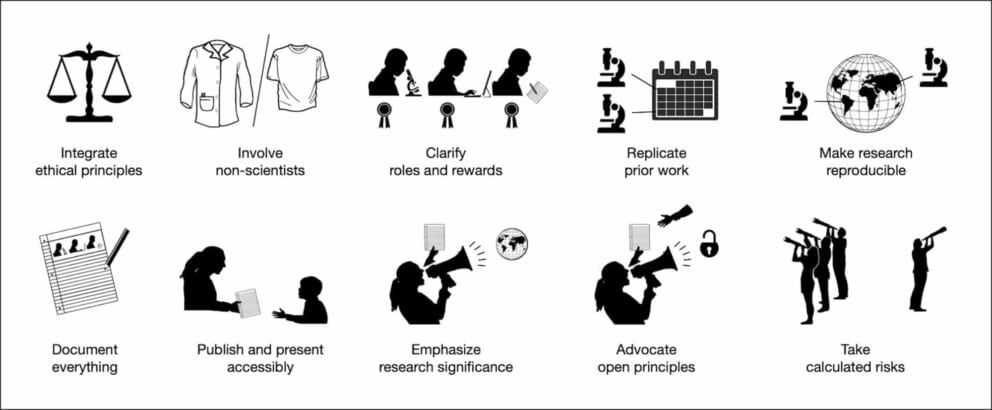 We hope that these simple rules will serve as a useful guide to best practice in open research in human health. More importantly, we hope that the wider community around human health research will use them as a starting point to address conventional scientific practices that are not being followed and, where these rules are not sufficient, share their own rules to improve the state of open, ethical and inclusive human health research. This is our call and challenge to all colleagues working in health and related fields: be the change you seek in science, and strive to make human health research a more humane, efficient and, above all, open enterprise.