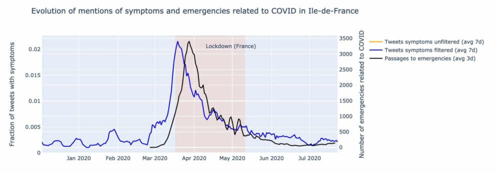 CRI researchers Marc Santolini and Bastian Greshake Tzovaras explore how the tweets on self-reported COVID19 symptoms can help predict future pandemic waves, and, more generally, the rise and fall of the disease. With the help of Naila El Haouari (intern at CRI) and Samuel Fraiberger (NYU & MIT MediaLab), they scanned public tweets from the Paris region and filtered them by symptom keywords. Although this already seems to give a good correlation between the number of tweets and disease progression, the automatic filtering is very crude. In general, people don't just tweet about symptoms when they're getting sick, but also about past times when they've been ill, or when they're talking about general news.