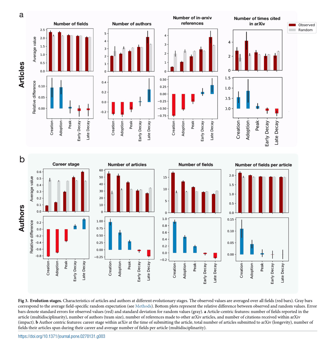 Using this method, the team then examined the characteristics shared by scientists and articles at different stages in the evolution of a research field: its creation, adoption, apogee, early and late decline. They found that early stages, when the field is in its most “innovative” phase, are characterized by small interdisciplinary teams of early-career researchers publishing groundbreaking work, while late phases highlight the role of large, specialized teams building on previous work in the field.