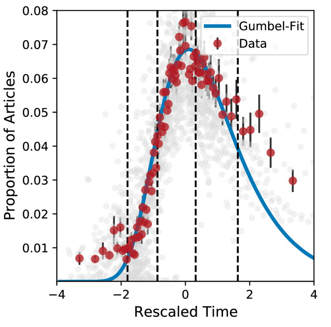 Some of these fields reached their peak in the 1990s and are hardly active today (such as high-energy physics), while others are booming (such as artificial intelligence). Some have been important for decades, while others have only attracted interest in recent years. Despite this diversity, the team's researchers found that all fields follow a well-defined upward and downward curve, characterized by a peak of activity (when the field is most active compared to the first article) and a width (duration of sustained activity). By estimating these parameters for each domain, the researchers were able to align all the curves on a universal “law” of evolution, enabling them to compare the different domains in the same terms.