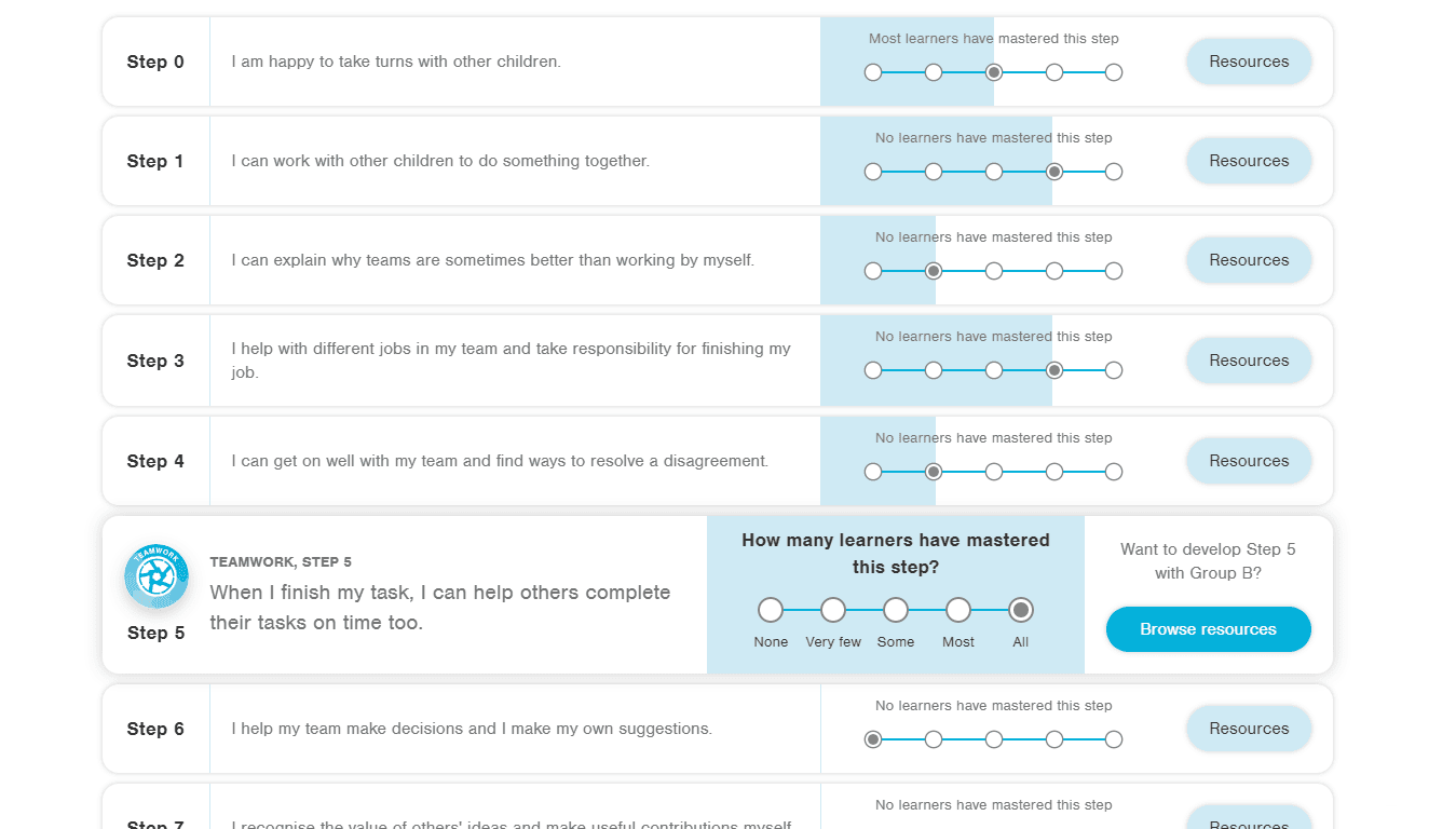 La vue d’ensemble des groupes montre les étapes qu’ils maîtrisent, ce qui vous permet de leur enseigner exactement ce qu’ils doivent apprendre ensuite.